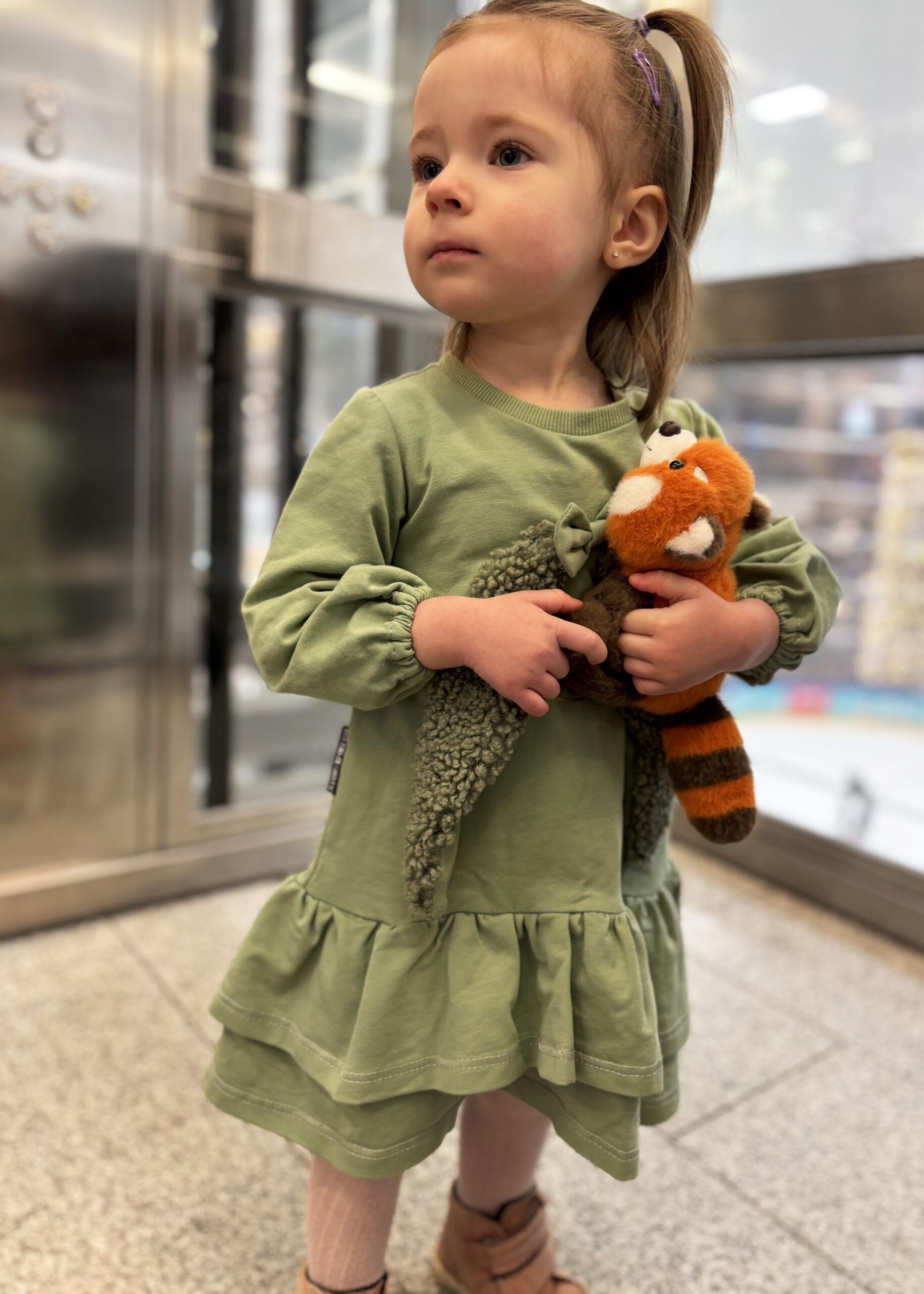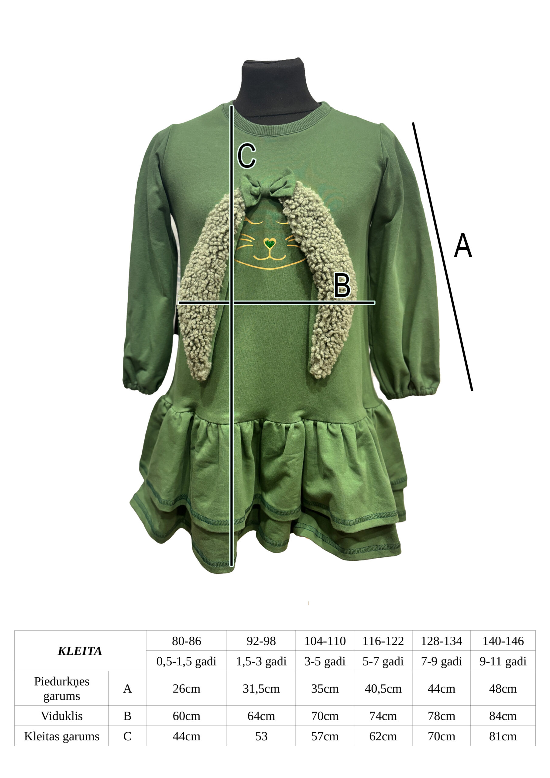 Īpašu šarmu kleitai piešķir 3D piešūtās, garās un skaistās truša ausis, kas kustas līdzi bērna kustībām un rada patiesu sajūsmas efektu. Mīkstais džersija audums nodrošina komfortu visas dienas garumā, bet oversize piegriezums ļauj brīvi kustēties un justies pavisam omulīgi.
