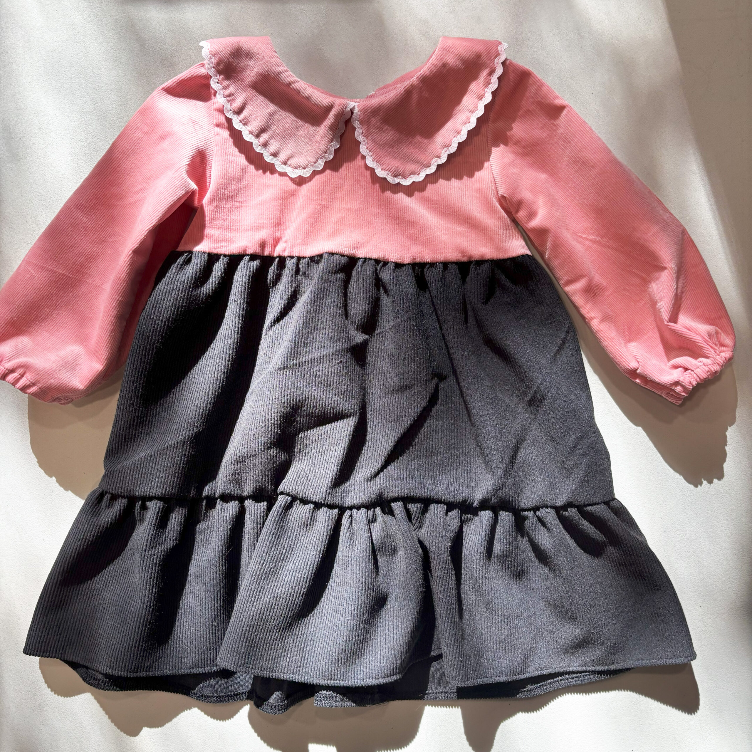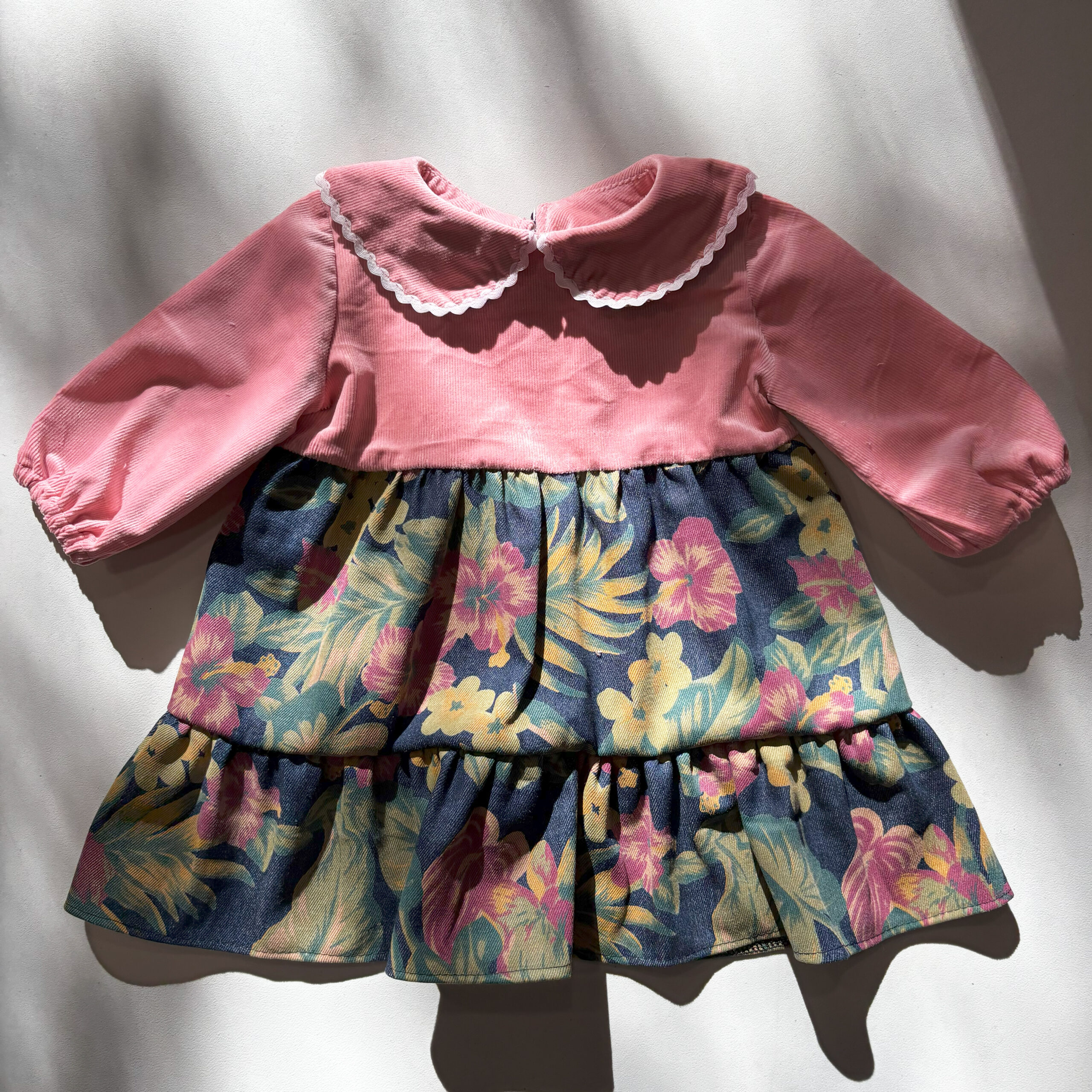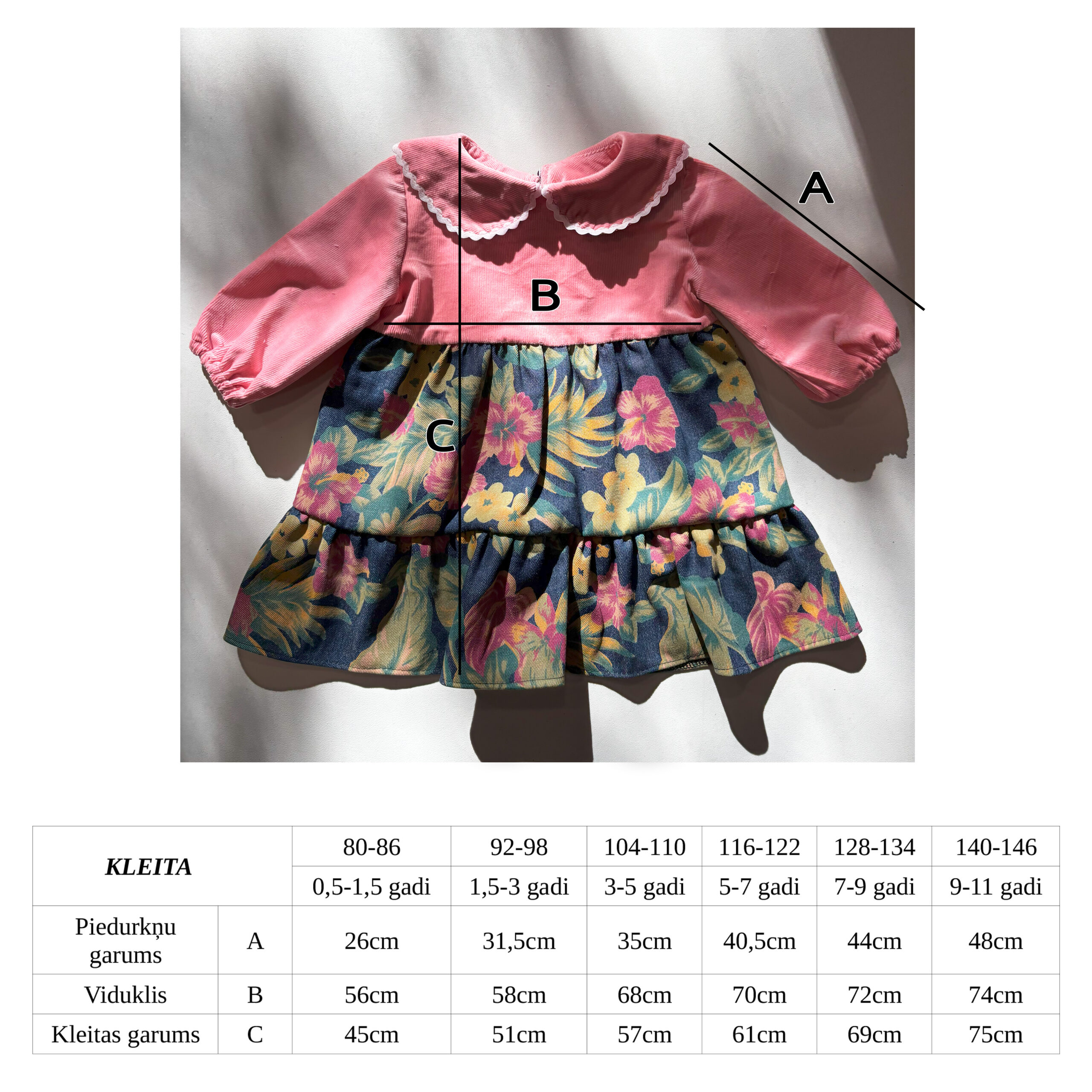 Mīlīga un ērta bērnu velūra kleita ikdienai un svētkiem. Mīksts velūra tops maigi bērrozā tonī sniedz komfortu un siltumu, bet apakšdaļa no kvalitatīva džinsa auduma ir rotāta ar romantisku rožu rakstu. Siluets ir brīvs un kustībām draudzīgs, lai mazajai dāmai būtu ērti skriet, rotaļāties un dejot.